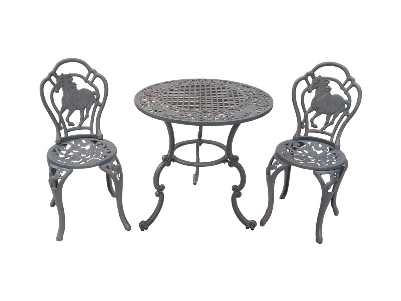 • (Chair):85cm tallx36cm widex37cm deep,(Table):76cm tallx71cm wide(Horse),76cm tallx76cm wide(leaves), Setting Weight:48kg. Leaves Setting:2xChairs-Leaves+1xIron Garden Table-Leaves, Horse Setting:2xChairs-Horses+1xIron Garden Table-Horses, Grape Setting:2xChairs-Grape+1xIron Garden Table-Leaves.